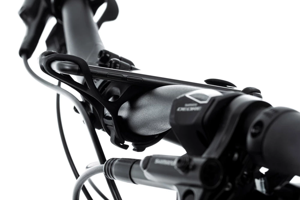 Le support élastique pour téléphone portable PURE d’ACID s’adapte à tous les modèles de smartphones et se monte sans aucun outil : Le support est placé sur le guidon, la sangle inférieure en silicone est tendue autour du guidon et accrochée. Les coins en silicone sont tirés sur les bords du smartphone. Il tient vraiment bien et l’angle d’inclinaison peut être ajusté.