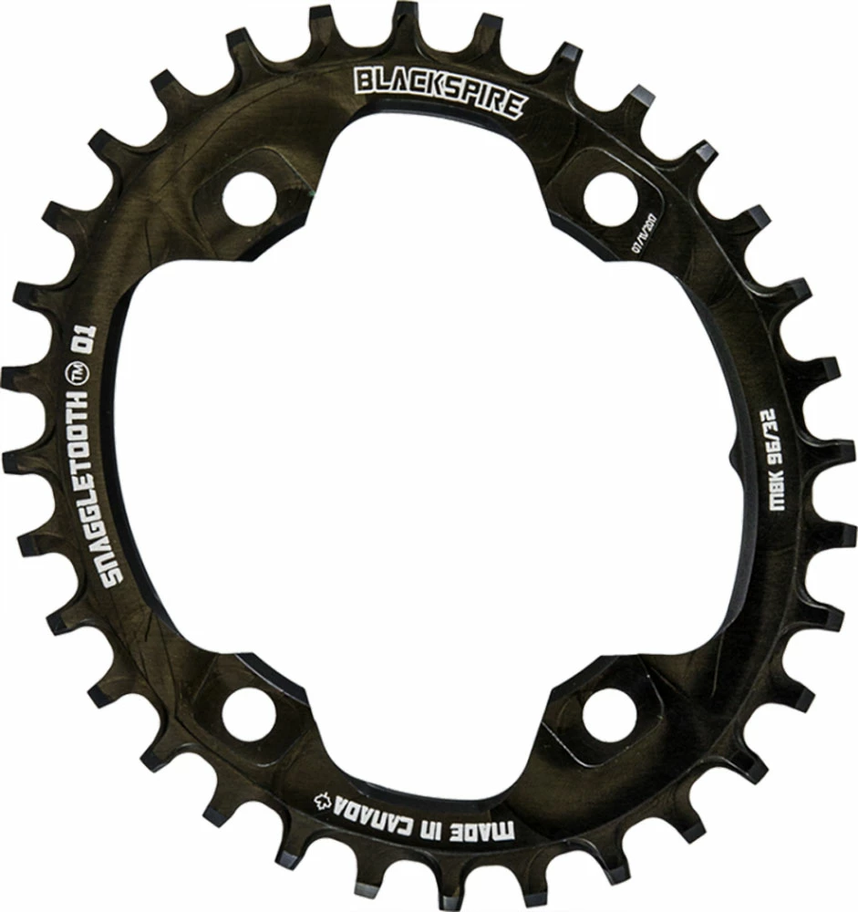 Le plateau ovale Snaggletooth Narrow Wide Shimano XT M8000 de Blackspire avec un cercle de trous de 96mm est en aluminium 7075 T6 et le profil de dents large/étroit assure une stabilité ultime de la chaîne. Il dispose d’une ovalité de 12-13% avec un timing de 115º selon le TDC (Top Dead Center).