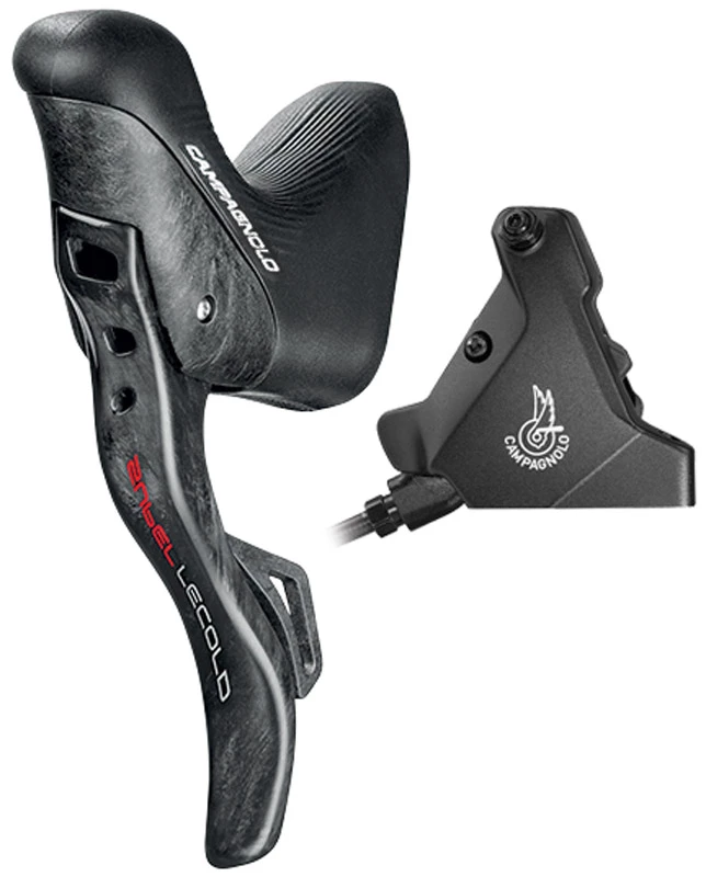 Les étriers de frein Campagnolo à montage plat assurent un freinage puissant et modulable dans toutes les situations grâce à des pistons de 22 millimètres de diamètre. Le retour des plaquettes a été optimisé afin de garantir l’absence de frottement lors du relâchement du levier de frein. Une plaque métallique spéciale, placée entre la plaquette et le piston de l’étrier, amortit les vibrations pendant le freinage. Les différents étriers de frein Campagnolo ont été conçus pour être montés avec le disque choisi par le cycliste et pour garantir toujours le plus haut niveau de performance. Il est en effet possible de choisir l’étrier de frein avec un disque de 140 mm (limité aux cyclistes ne pesant pas plus de 82 kg) ou de 160 mm de diamètre. Une attention particulière a été accordée à la facilité des opérations d’entretien et de montage : les plaquettes sont dotées de témoins d’usure et leur remplacement est facilité par l’absence de ressorts de rappel physiques. En outre, on a travaillé sur l’insertion du disque dans l’étrier pour rendre le changement de roue plus facile et plus rapide.