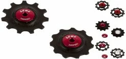 Jeu de poulies de rechange Cema pour dérailleurs Shimano 9-/10-/11 vitesses et SRAM 10-/11 vitesses. Selon la version, les poulies ont un corps en aluminium ou en plastique renforcé de carbone et sont équipées d’un roulement en céramique SRC, en céramique intégrale ou en acier inoxydable.