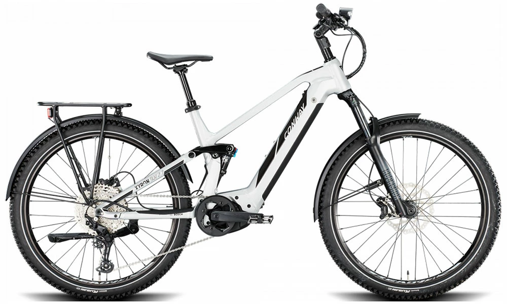 The Conway Xyron SUV 2.7 is probably the most comfortable and yet most suitable E-MTB for everyday use. Equipped with lights, a rear rack and mudguards, it combines the comfort of an e-fully with the practicality of an urban bike. It impresses with a powerful Bosch Performance CX Gen 4 motor. The 625 Wh battery reliably supplies you with the necessary power so that you can enjoy your time on your bike for even longer.
