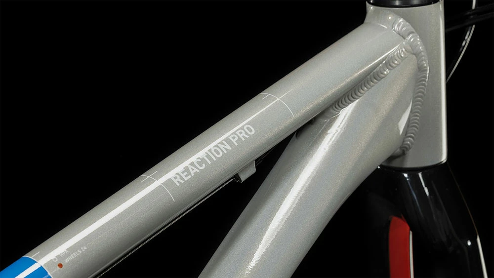The Reaction 240 Pro is made from the same kind of heat-treated 6061 aluminium tubes that you’ll find in the performance adult bikes. CUBE has also use the same mechanical tube-forming process to adjust tube shapes for the best combination of strength and weight, and tyre clearance. There’s a full carbon fork with thru axle, to save even more weight. Disc brake mounts and cable routing allow for the greater safety and stopping power of discs. And a replaceable derailleur hanger insures against expensive repairs in the event of minor mishaps