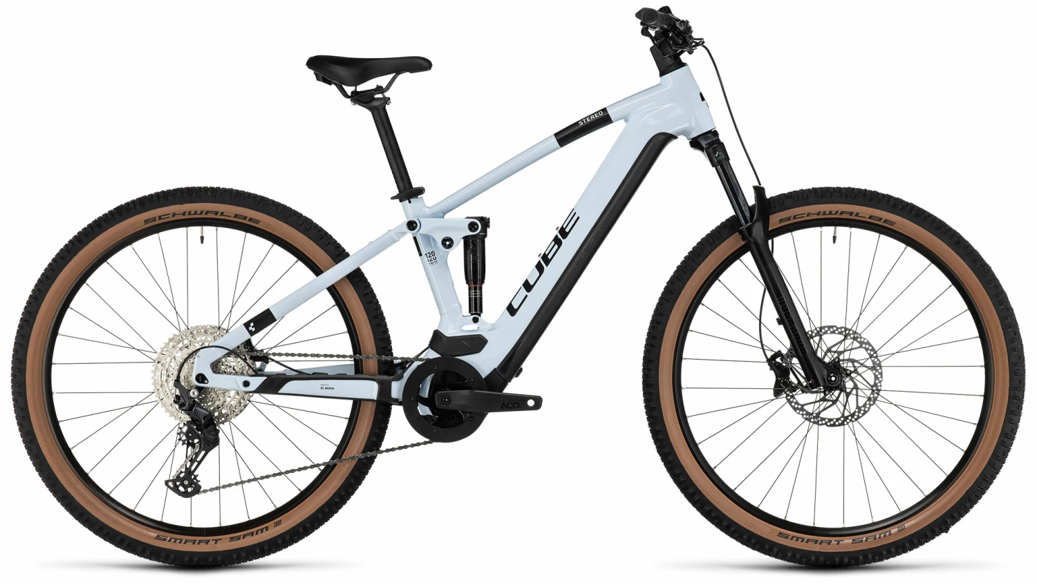 There’s some clever stuff going on inside the Stereo Hybrid 120’s sleek frame. The Modular Battery System tucks the battery out of sight – and out of the way of dust and water. The refined four-bar suspension design keeps you isolated from trail shocks and vibration, and Cube wrapped the whole lot in their Comfort Geometry – with a stiffness-enhancing Boost 148 rear end and 1.5in head tube – for easy handling. We even made it simple to add accessories like mudguards, a luggage carrier and a kickstand. And the Size Split system means there’s a Stereo Hybrid 120 to suit every rider.