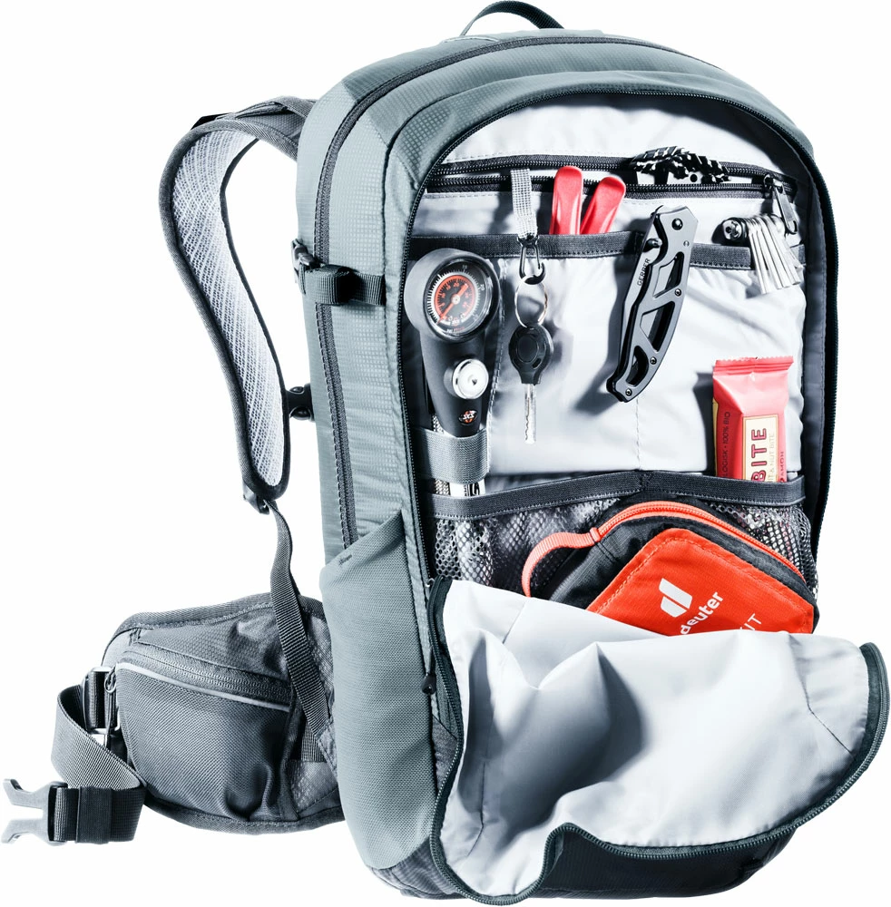 Et bien sûr, il y a la protection dorsale certifiée par le TÜV/GS, facile à enlever et offrant une sécurité maximale en cas de problème. Le dos raccourci spécialement pour les femmes avec le système éprouvé et léger deuter Airstripes permet une excellente ventilation dans le dos.