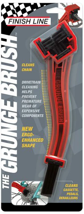 Le nettoyage de la chaîne et du pignon n’a jamais été aussi simple et rapide qu’avec la brosse à chaîne The Grunge Brush de Finish Line ! Les poils en forme de fer à cheval permettent d’éliminer chaque particule de saleté et de nettoyer parfaitement la chaîne. Les longs poils à l’autre extrémité sont utilisés pour nettoyer les composants tels que le pignon, le dérailleur avant, les manivelles, les freins et les pédales.