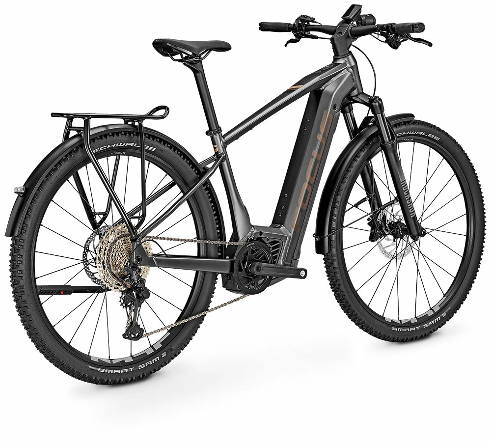The FOCUS AVENTURA² with powerful Bosch Performance CX Smart E-drive offers a peak range of 750 Wh. The battery sits beautifully integrated in the down tube, but can be removed for charging. With luggage rack, mudguards, stand and light, the world is open to you, thanks to 100 mm suspension fork and mountain bike tires it also goes far beyond the city limits.