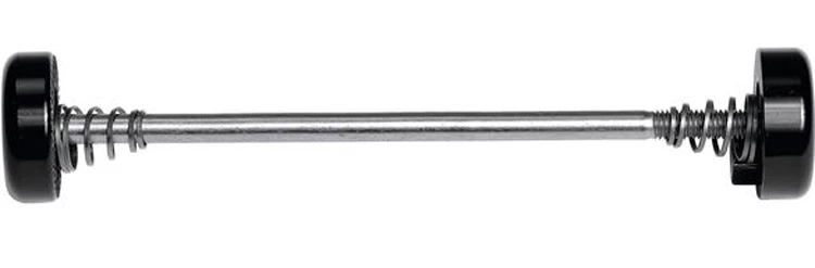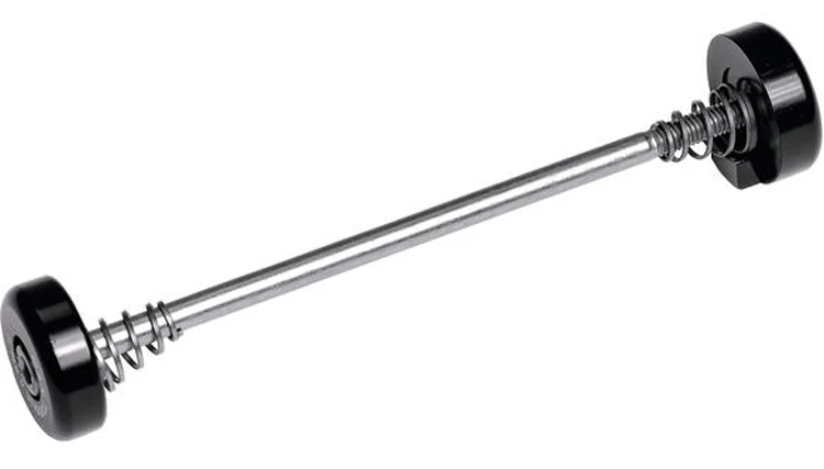 Axe de roue pour la remorque de transport FollowMe Cargo. Les écrous plats de cet axe empêchent les sacs de rangement de frotter sur les extrémités de l’axe.