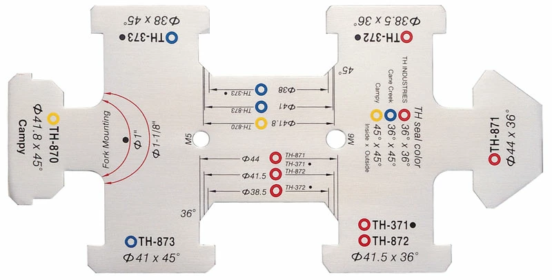 Jauge de mesure angulaire pour jeu de direction 1″ et 1 1/8″. L’aide en acier inoxydable découpé au laser, avec code couleur pour différents roulements à billes.