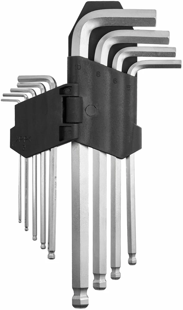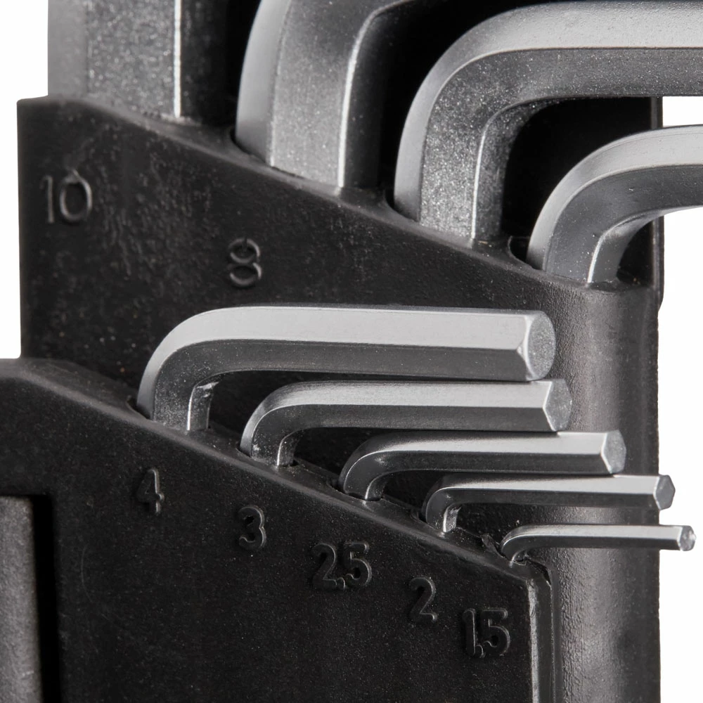Outil absolument indispensable pour les cyclistes : la clé hexagonale ! Quoi de mieux qu’un set comprenant toutes les tailles courantes pour la réparation ou le réglage ? Le set de neuf pièces garantit un travail sans souci à l’atelier et sur la route. Toutes les tailles importantes sont disponibles dans le support rabattable : en version normale et en version à tête ronde de l’autre côté. Ainsi, même les vis difficiles d’accès n’ont aucune chance.