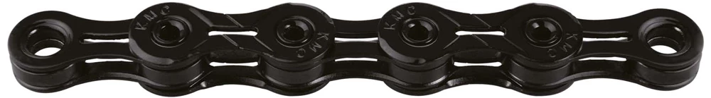 La chaîne super légère X10 DLC 10 vitesses de KMC sans dépendance au sens de marche et avec un revêtement de surface Diamond Like Coating pour les systèmes de changement de vitesse 10 vitesses.