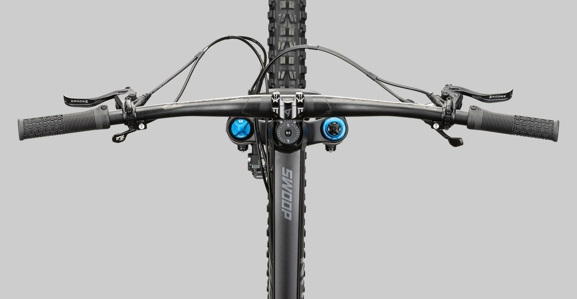It starts with the Fox suspension with the Fox 38 Float Factory fork with fine-adjustable FIT GRIP2 shock cartridge and the Fox Float X2 Factory shock with 2-position adjustment. Both are coated with the classy Kashima coating, which reduces the response to a minimum. The incredible lightweight Newmen wheelset with Maxxis Minion DHR II and DHF tires, both with the grippy Maxxterra/Exo+ rubber compound, deliver an impressive level of grip. The SWOOP AL 10.0 is decelerated by the Magura MT7 brakes and the matching, large Magura Storm HC brake discs. The SRAM GX Eagle drive leaves you with enough reserves for even the toughest climbs thanks to its wide spread of 10-52 teeth. The highlight equipment is rounded off with the RaceFace Turbine R cockpit and the Fox Transfer seat post, which also makes for a visual highlight with the chic and classy Kashima Coating.
