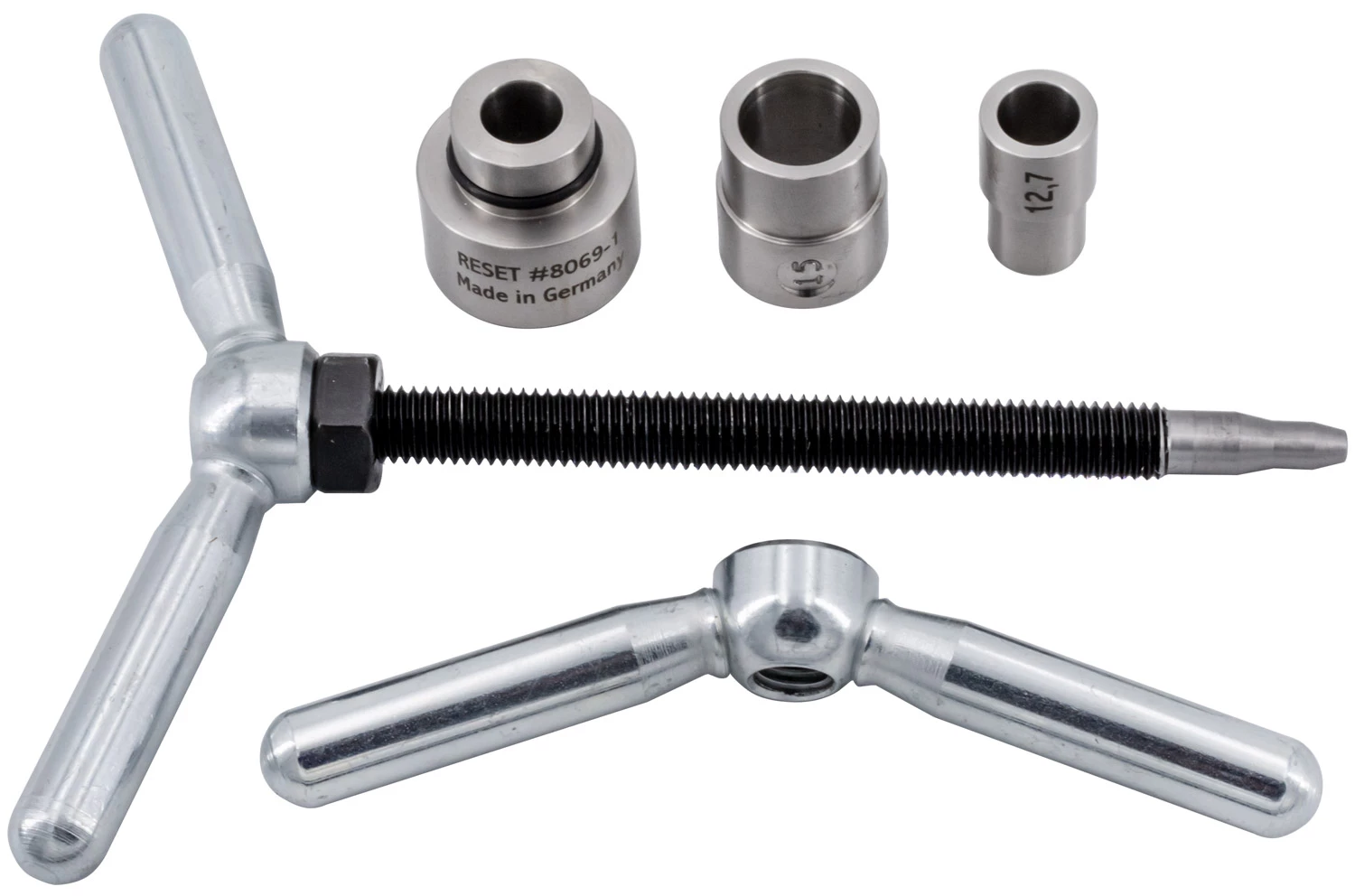 Le RESET Presswerk est un outil universel d’emmanchement et d’extraction de Reset Racing. L’outil de base compact se compose d’une broche solide avec un filet roulé, de deux écrous de serrage à double bras et d’un porte-outil avec des roulements à billes. Après avoir fixé les adaptateurs, les opérations d’emmanchement et de retrait des roulements à billes, des douilles d’amortisseurs, des roulements à aiguilles, etc. peuvent être effectuées sans grand effort.