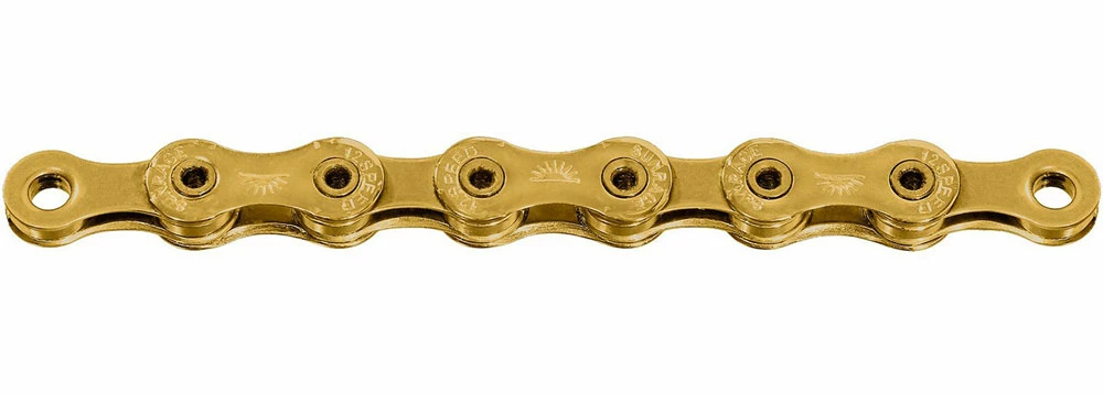 La chaîne durable SunRace CN12H 12 vitesses avec 126 maillons, Hollow Pins et revêtement en nitrure de titane pour les systèmes de dérailleurs Sram/Shimano 12 vitesses. Avec cadenas Easy Link.