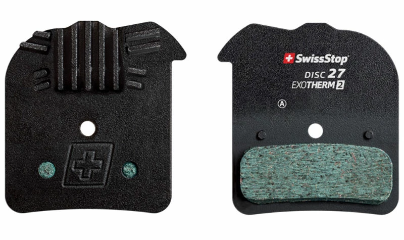 Le SwissStop 27 EXOTherm2 combine un mélange de gomme extrêmement durable et modulable de manière homogène avec une plaque arrière dotée d’ailettes de refroidissement qui permet un freinage stable et puissant dans toutes les conditions.