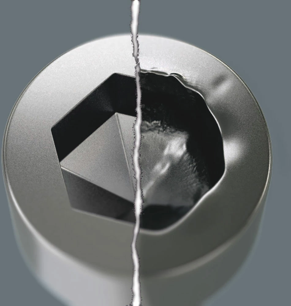 Le problème des vis à six pans creux tient à la finesse des surfaces d’appui sur lesquelles s’opère la transmission de la force depuis l’outil. Résultat : la tête de vis peut être endommagée. Les outils Hex-Plus possèdent des surfaces d’appui plus larges qui empêchent ce problème. Le couple transmis peut être jusqu’à 20% plus élevé. Bon à savoir: les outils Hex-Plus s’utilisent sur toutes les vis à six pans creux standard !