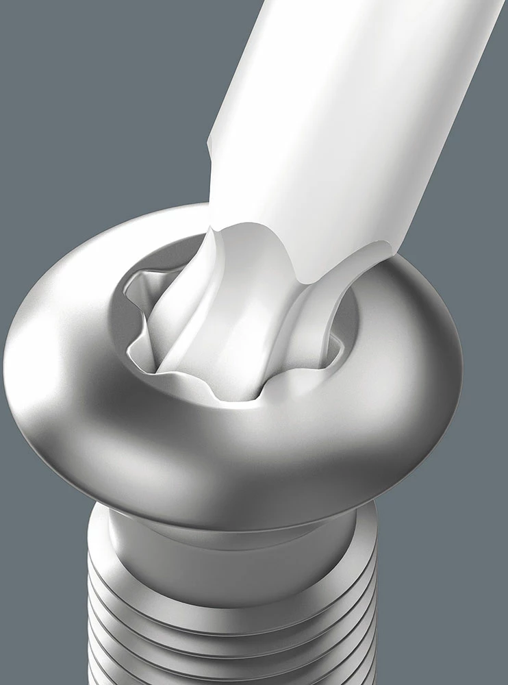 Les pointes sphériques permettent de faire basculer ou pivoter l’axe de l’outil par rapport à celui de la vis, autorisant un vissage « en coin ».